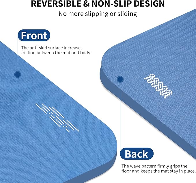 • Non-slip & Reversible Design: The anti-skid surface increases the friction between the mat and body which can prevent your hands, knees and feet from slipping during practice. The wave patterns on back firmly grip the floor ensure the mat stay in place.
