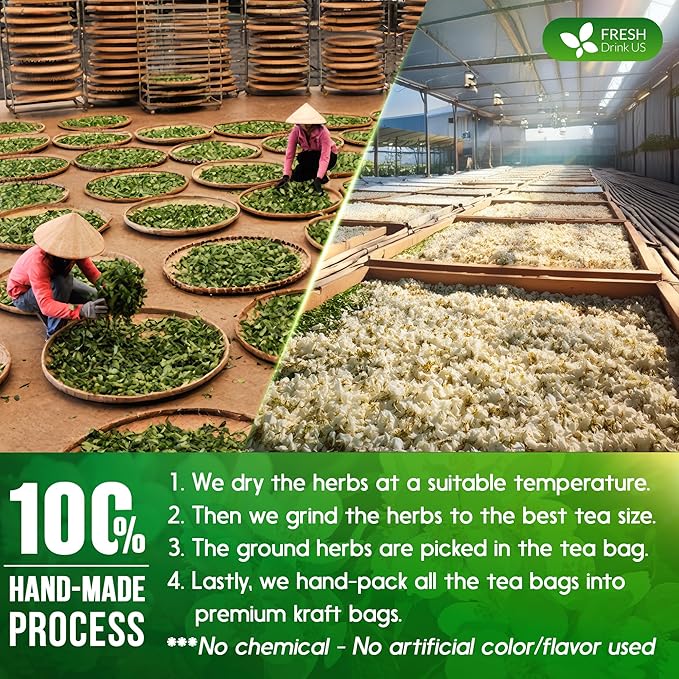 • ☘️ JASMINE GREEN TEA BAGS MADE BY A HAND-MADE PROCESS: Green Tea leaves are picked at their flavorful/colorful peak and naturally sun-dried to perfection. We scent the Green tea leaves by Jasmine flowers for the utmost quality. Then we grind the herbal leaves into the best tea size. Next, we immediately pack it in eco-friendly tea bags. Lastly, we pack the tea bags into food-grade kraft bags for ultimate freshness.