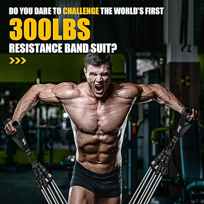 • 【Further Upgraded 420LBS bands】To meet the needs of fitness enthusiasts for strength training. THE WORLD'S FIRST 420LBS RESISTANCE BAND SUIT HAS COME OUT! A real man's resistance band suit, it's here, do you dare to challenge it? The fitness bands can reach up to 420 pounds with 6 different resistance levels(45lbs, 55lbs, 65lbs, 75lbs, 85lbs, 95lbs). You can freely combine our resistance bands according to your strength!