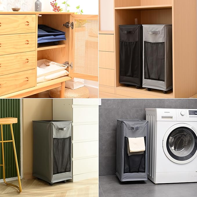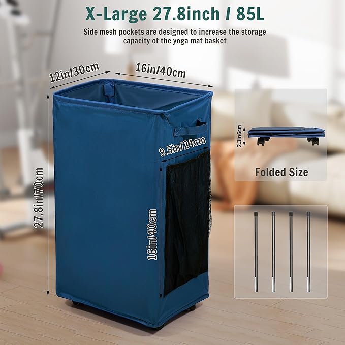 • WIDENED SIZE: Upgraded yoga mat basket with 85L capacity measures 16"(L) x 12"(W) x 27.8"(H) / 41x30x70CM can easily accommodate 4 different sizes of yoga mats, 2 foam rollers, as well as kettlebells, yoga bricks and more