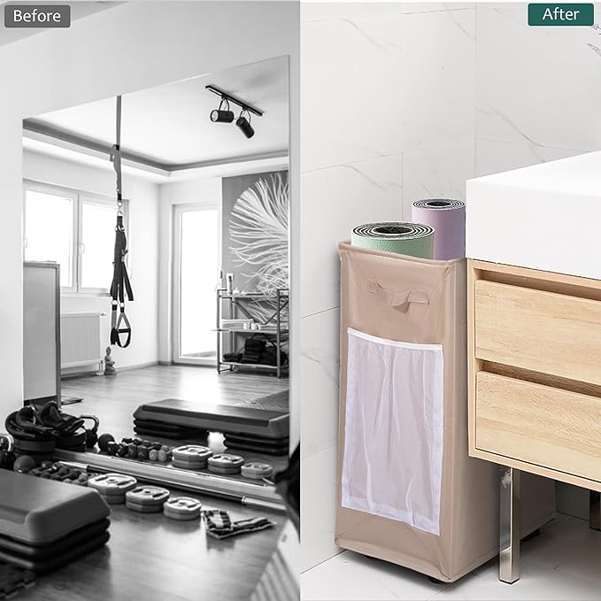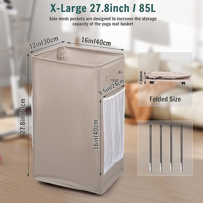 • WIDENED SIZE: Upgraded yoga mat basket with 85L capacity measures 16"(L) x 12"(W) x 27.8"(H) / 41x30x70CM can easily accommodate 4 different sizes of yoga mats, 2 foam rollers, as well as kettlebells, yoga bricks and more