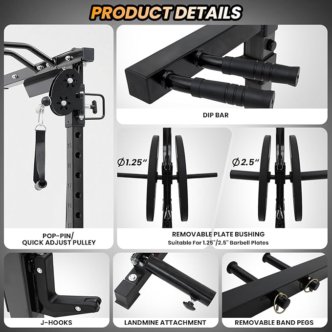 • FULLY EQUIPPED FOR WORKOUTS: No need to buy the extra fitness accessories. All come with home gym squat rack. We provides 23 free attachments, 2 Nylon Safety Straps, 2 J hooks, 2 Dip bars, 4 Resistance Band Pegs, a Lat Pull Down Bar, a Cable Bar, a 360 degree Detachable Landmine, a Ankle Strap, a Tricep Rope, 2 Cable Handles, a Chain, 4 Weight Holder Clips and a Footboard.