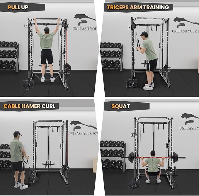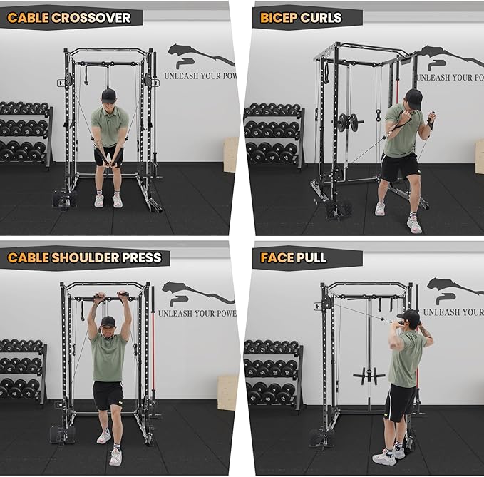 • ENDLESS TRAINING POSSIBILITIES: No home or garage gym should be without a power rack. Our power cage can bring power rack, cable Cross-Over machine, lat pulldown station, low row station (includes footplate attachment), chin station, dip station, core trainer, landmine station to your home gym at the same time. You can train your full-body with just one device. It can be used by multiple family members at the same time, making it perfect for your home gym.