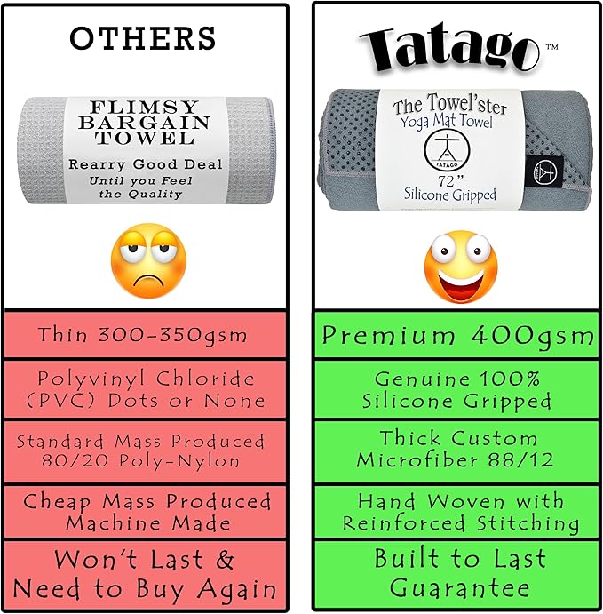 • Lots Of Grip, While You Drip: Tatago hot yoga mat towel non slip grip for covering your yoga or pilates mat during practice. The yoga towel non slip silicone gripped backside, & soft and absorbent microfiber blend ensure your hot yoga towel won't skid or bunch up during practice.