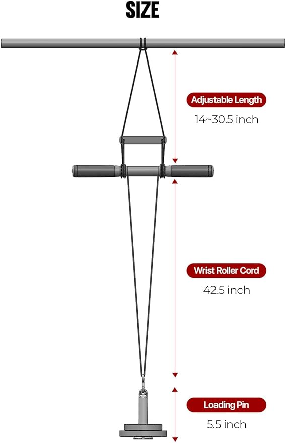 • Adjustable Length of Hanging Component: 14~30.5'', Pracord's length of Wrist Roller : 42.5'', Wrist Roller Size : 17.7'' * 1.5'' (45 * 3.8cm)