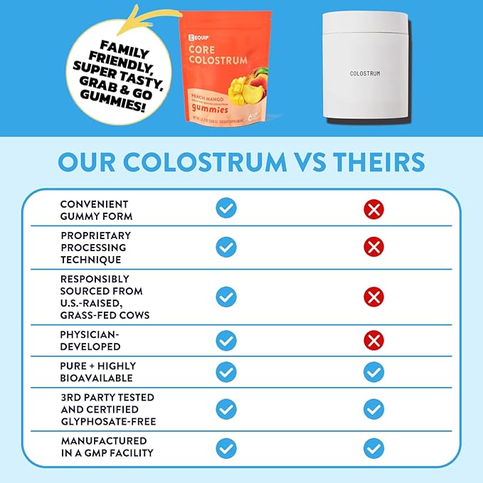 Equip Foods Core Bovine Colostrum Gummies, Delicious 1g Per Seving Grass Fed Colostrum Supplement - Gut Health, Immunity, Recovery, Hair & Skin - 60 Bovine Colostrum Gummies, 30 Servings, Peach Mango