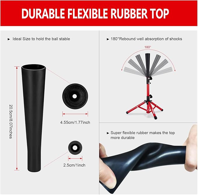 • ⚾🥎【DURABLE-HIGH QUALITY WRAPPED RUBBER】Every baseball batting tee's top is hand rolled, strong and durable, which is suitable for kinds of balls, with good elasticity, like baseball, softball, training ball and to have the real hitting feelings with special size design. Built with good quality rubber, the tball stand top can holds the balls stablely.
