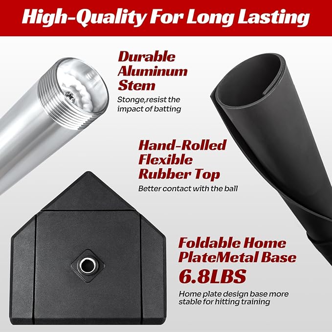 • 【Durable For Long Lasting】 This batting tee is made of industrial grade hand-rolled rubber, aluminum stem and solid metal base for extreme durability and make you better contact the balls,and that will last season after season for teeball, baseball, and softball.