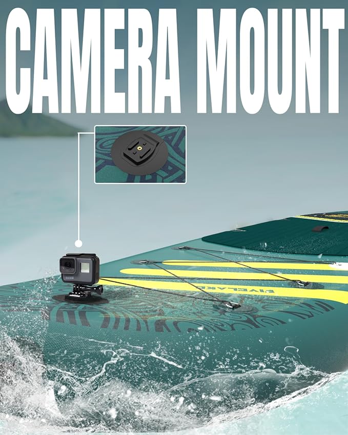 • All-Around Execllence:Featuring 6 bungee cords and extra D-rings, this board is versatile for gear, an SUP seat, or dual-use kayak paddles. It includes a camera mount and a fishing rod holder for capturing memories and enjoying peaceful fishing.