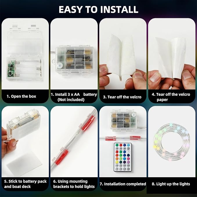 • Battery Powered Boat Lights : This lights provide 24ft battery RGB lights, Powered by 3 Pcs AA batteries (not included), very safe to use and touch, portable to anywhere and a great idea for any boats. Turn on the switch back of the battery pack, then you can enjoy the colorful boat lights at night