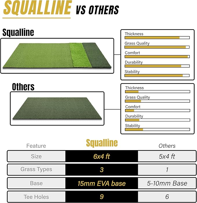 • 𝗦𝗵𝗼𝗰𝗸 𝗔𝗯𝘀𝗼𝗿𝗽𝘁𝗶𝗼𝗻 & 𝗜𝗺𝗽𝗮𝗰𝘁 𝗣𝗿𝗼𝘁𝗲𝗰𝘁𝗶𝗼𝗻: The thick 15mm EVA base absorbs impact to protect your wrists, elbows, and clubs—helping prevent injury and reduce equipment damage.