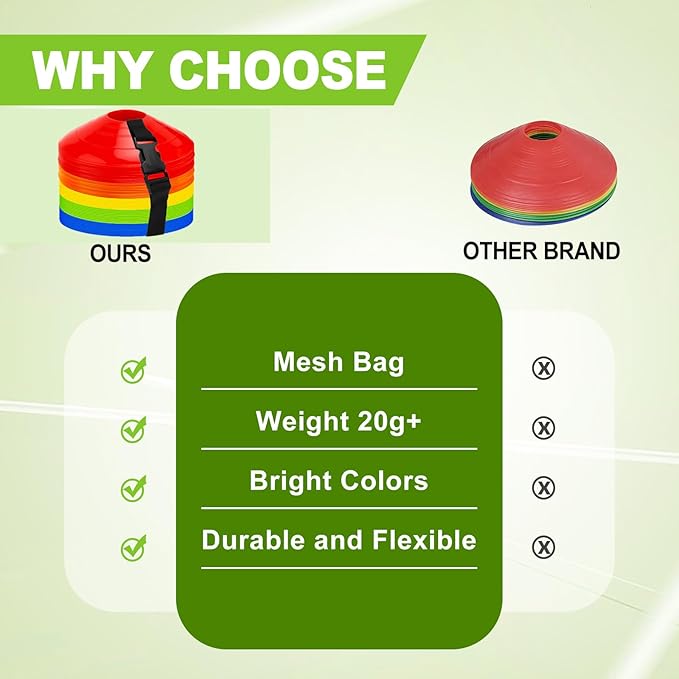 • Enhanced Visibility: Designed in vibrant colors like neon yellow or orange, this agility soccer cones ensures high visibility on the field or court. Athletes can easily spot the cones soccer from a distance, aiding in quick reaction times and reducing the risk of collisions or accidents during training