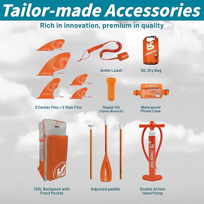 • More Fun - Exclusively from iTAOSTAR, our five tailored fins (3 central + 2 side fins) adapt to various scenrios, offering diverse balance and zero fin-loss worries. Dive into personalized paddleboarding fun without limits