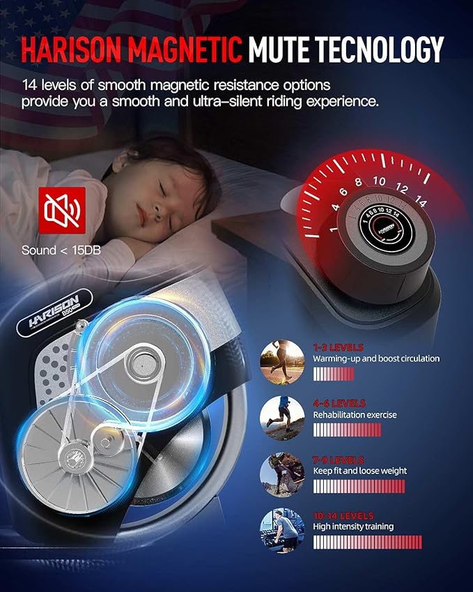 • Ultra Silent Recumbent Bike: HARISON recumbent exercise bike employs magnetic resistance technology to provide you a whisper-quiet, joint-friendly workout, eliminating any potential disturbances to your surroundings. Ideal for diverse needs 1-3 levels for warming up, 4-6 levels for rehabilitation, 7-9 levels for body shaping, 10-14 levels for muscle building.