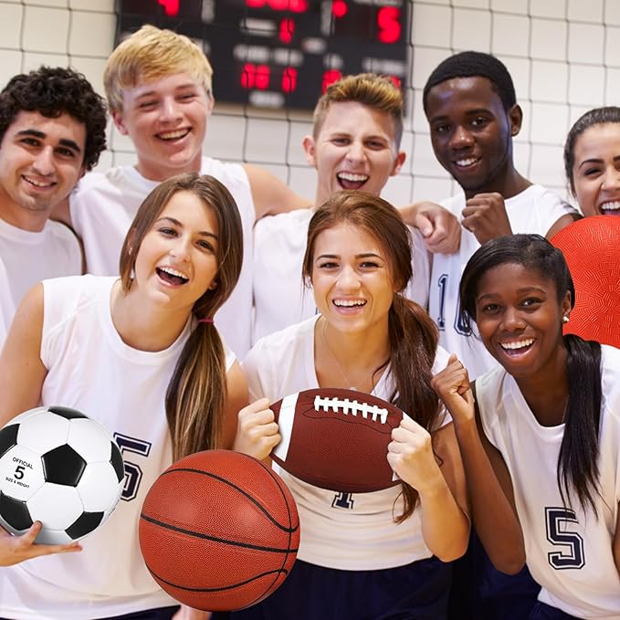 • Official Size: our athletic ball is all in official size; Size 7 basketball is about 29.5 inches in circumference; Size 5 soccer ball is about 8.7 inches in diameter; Size 9 football ball is about 11.2 inches in length, and about 21 inches in circumference; Playground ball is about 9 inches in diameter; The ball set provides a more authentic and professional experience