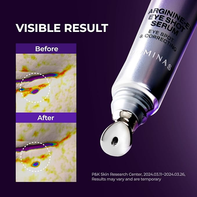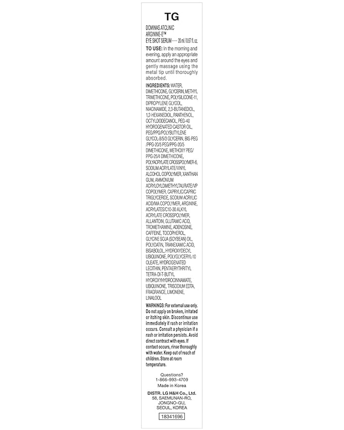 • DOMINAS ATCLINIC ARGININE-E EYE SHOT SERUM (0.67 fl oz) - This advanced eye serum addresses under-eye concerns such as discoloration, puffiness, fine lines, and uneven tone. Formulated with Arginine-E, Polydatin, and other powerful ingredients, it revitalizes and enhances the delicate skin around the eyes for a refreshed appearance.