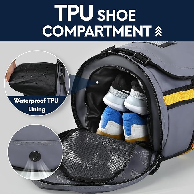 • LARGE CAPACITY TRAVEL DUFFLE: The main compartment with multiple pockets to meet your needs for sports or travel. One large zippered mesh pocket under the open flap to store small items or computers. Outside of the bag with 1 zippered front pocket for storing your personal items. The separate shoe compartment has 1 zippered mesh pocket and 1 ventilation hole