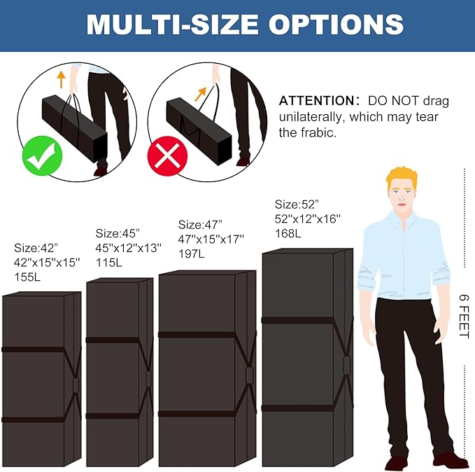 • Dimensions when full: 52" x 12" x 16" (L*W*H) with extra-large capacity, COOLBEBE travel bag with roomy interior for storing items. Ideal for camping, hunting and sport travel and even fits for umbrella style strollers