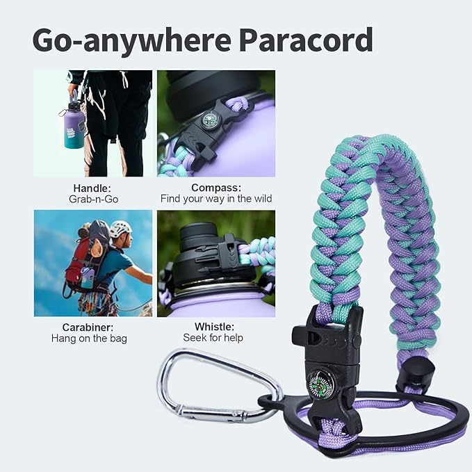 • Palm Fitting Paracord Handle: Compared to handle lids, nylon paracord on the bottle gives you more choices in terms of color coordination and coziness on your hands. Match the handle with your bottle to make a complete outdoorsy look. Compass and carabiner can be lifesavers for hiking and other expeditions