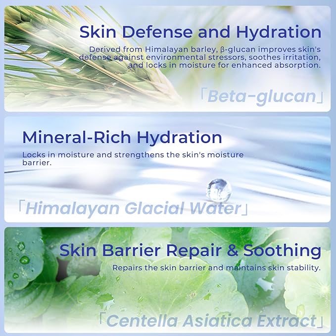 • Skin Defense and Hydration: Derived from Himalayan barley, β-glucan improves skin's defense against environmental stressors, soothes irritation, and locks in moisture for enhanced absorption.