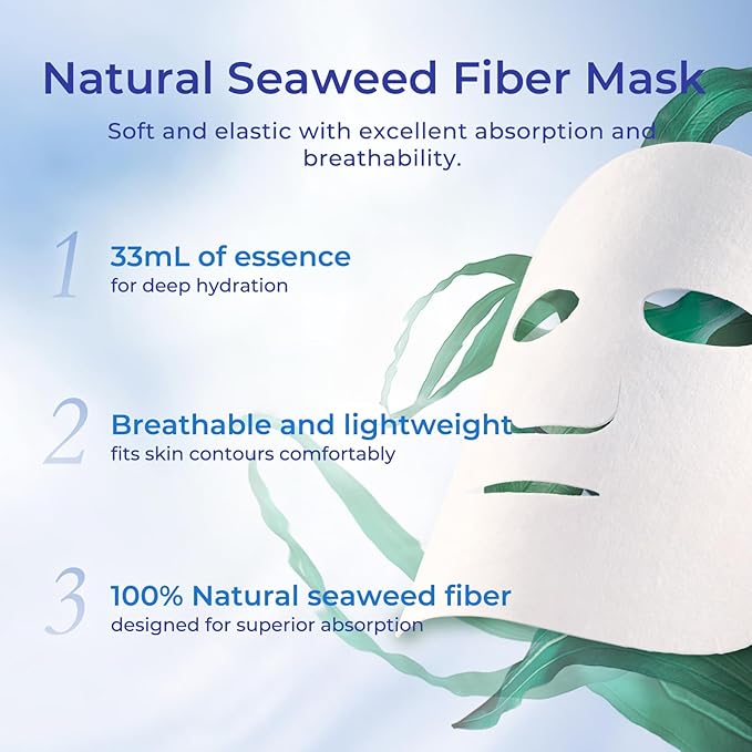 • Seaweed Fiber Mask Fabric: Soft and elastic, the mask fits instantly upon application. Invisible and breathable, it feels light and comfortable. With 33mL of essence, indulge in 15 minutes of moisturizing nourishment.