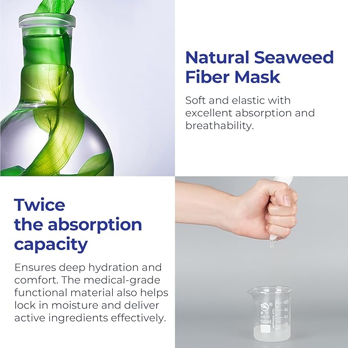 • Enhanced Absorption: Made from natural seaweed fiber, it offers twice the absorption capacity of silk, ensuring deep hydration and comfort. The medical-grade functional material also helps lock in moisture and deliver active ingredients effectively.