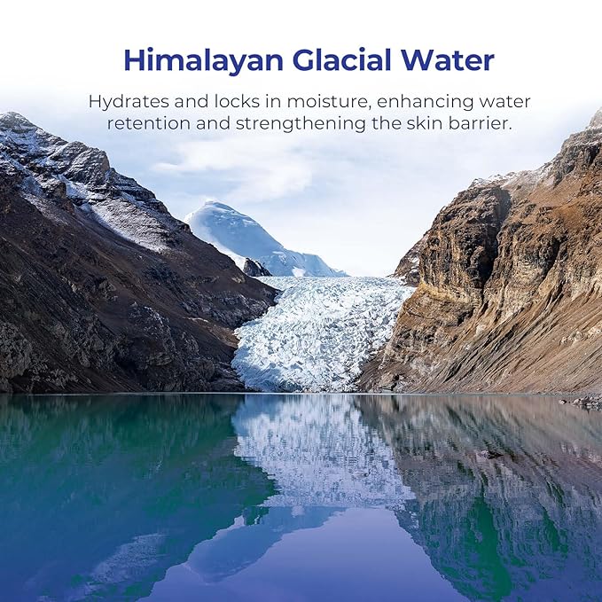 • Mineral-Rich Hydration: Himalayan Glacial Water deeply hydrates, enhancing moisture retention and strengthening the skin barrier for soft, plump skin.