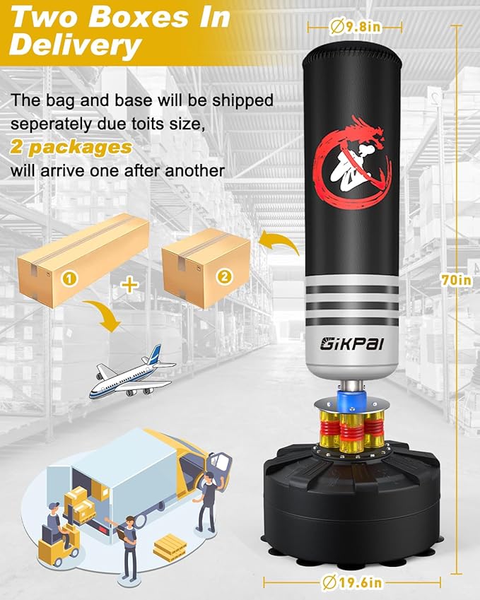 • Complete Boxing Equipment Set: The package includes a free standing punching bag and a pair of high-quality 12oz boxing gloves. Base and bag ship separately due to size. Pls reach us if only one arrives.