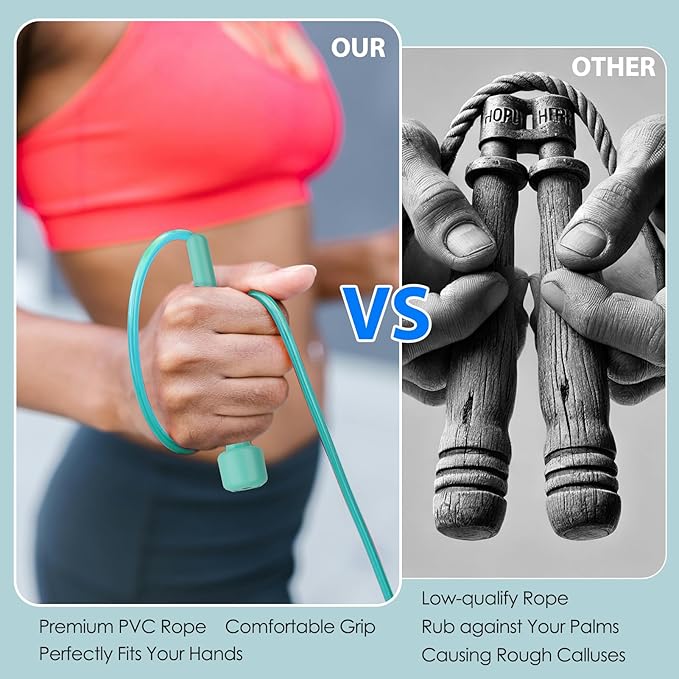 • Ergonomic Handles: Enjoy a perfect grip with our ergonomically designed handles. Crafted for maximum comfort, these handles feature a non-slip, sweat-resistant surface that ensures a secure hold during even the most intense workouts. The thoughtful design keeps your hands dry and comfortable, making every jump smooth and enjoyable.