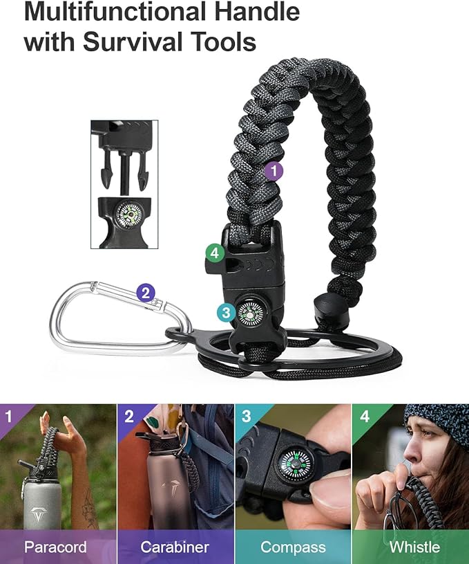 • Ready for adventures: Topre 40oz water bottles includes paracord handle is crafted from sturdy braided rope with an attached survival kit. This includes a compass, a whistle, and a clip, making it an ideal companion for any outdoor activity — be it camping,hiking or exploring new places through travelling.