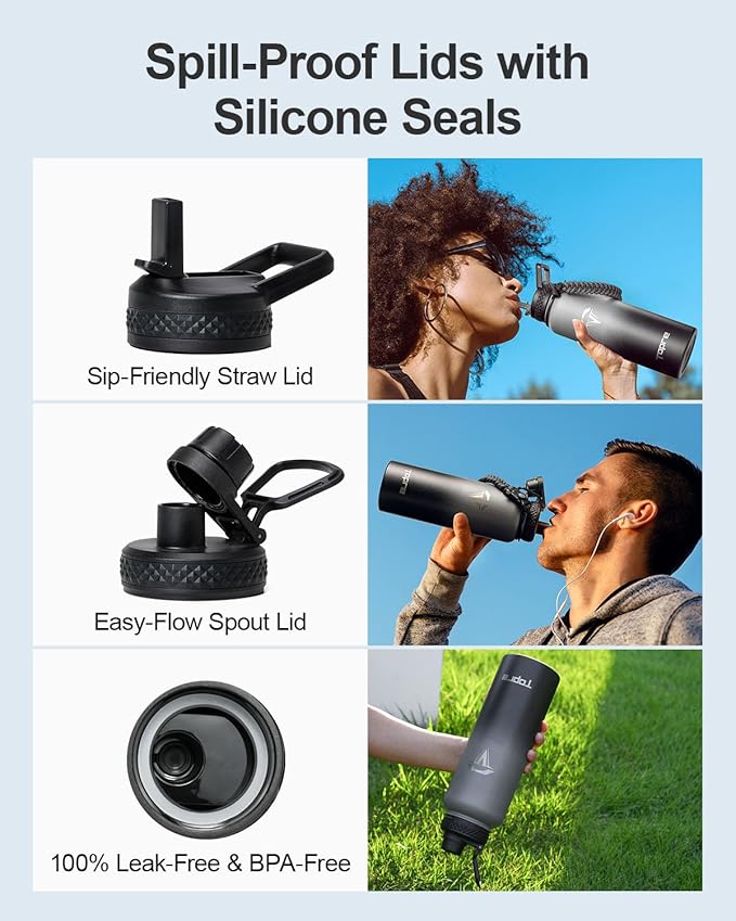 • 100% Leak-Proof: Topre 40 oz stainless steel water bottles includes two lids—a straw lid and a spout lid. Both are equipped with silicone rings to prevent any spills or leaks, and are completely BPA-free for your peace of mind.