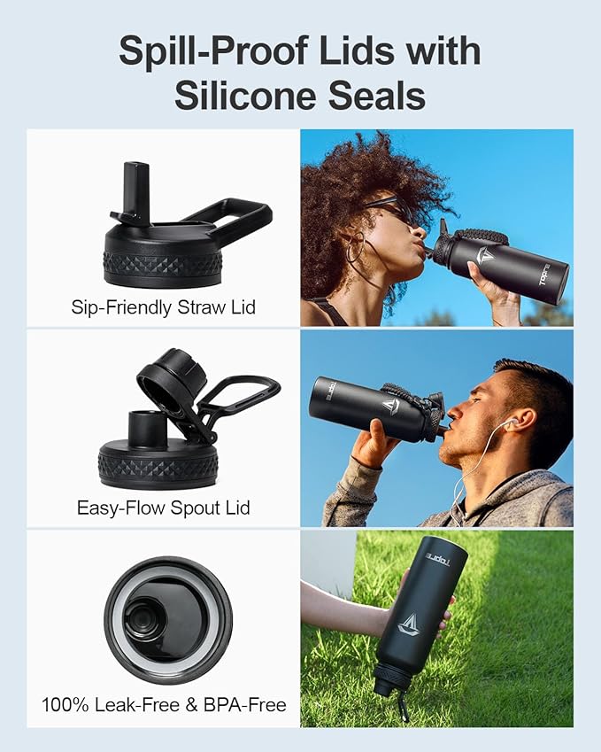 • 100% Leak-Proof: Topre 40 oz stainless steel water bottles includes two lids—a straw lid and a spout lid. Both are equipped with silicone rings to prevent any spills or leaks, and are completely BPA-free for your peace of mind.