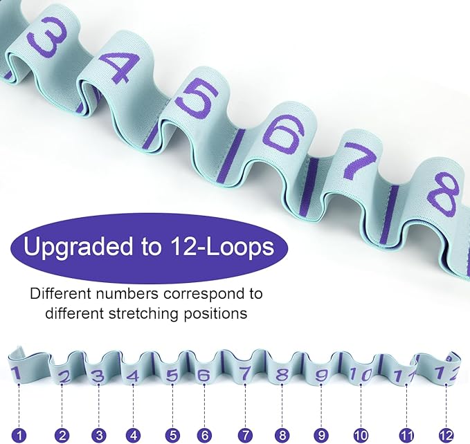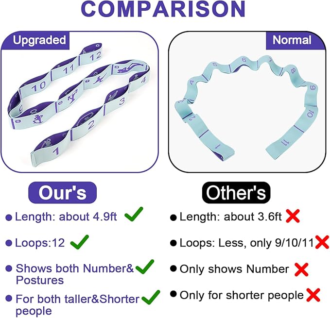 • ❖【2PCS Stretching Straps with Extra Long 12 Loops Design】 This stretch band has been UPGRADED. We lengthened the size and embroidered with a variety of yoga poses for user's reference. You don't have to worry about getting a size that's too short anymore!