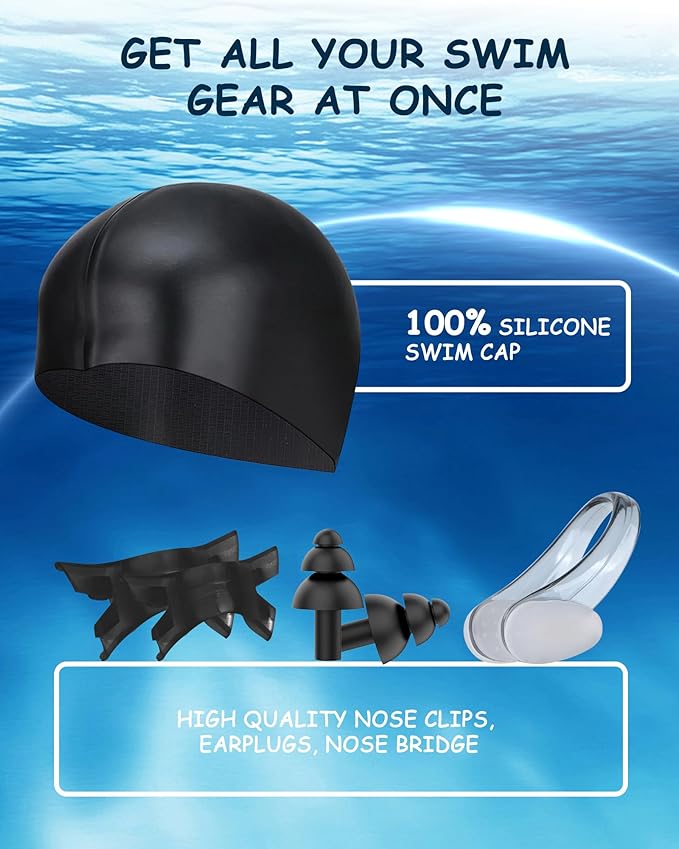 • VALUE KIDS SWIM GOGGLES SET - Get everything you need for swimming in just one choice: Swim goggles + Swim cap + Nose clip + Earplugs + Goggles case. With all this swim equipment together, kids can enjoy swimming in comfort and safety. Note: All accessories are stored in the goggle case.