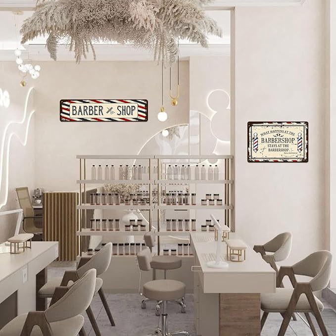 Barber Shop Decor Accessories - Vintage Barbershop Metal Tin Signs Haircut Wall Art Posters Gifts for Men Decorations - What Happens At The Barbershop Stays At The Barbershop Sign 8x12 Inch