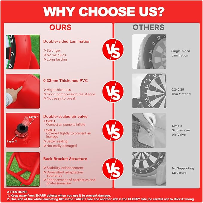 • Excellent Manufacturing Process: Inflatable dart board is made of premium-quality PVC material, which can accompany you for many years, and gives you a pleasant backyard dartboard game experience.