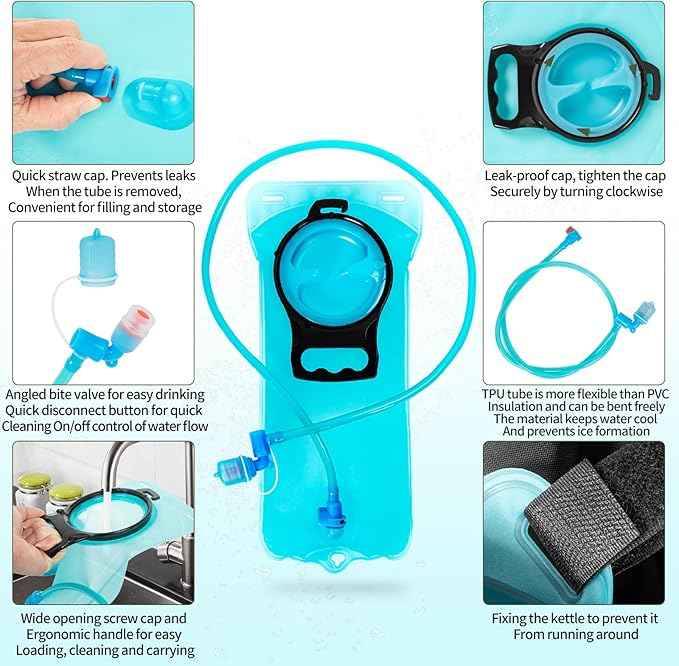 • 【Professional 2L Water Bag】: LASUK Hydration Backpack is an extra large 2L water bag made of TPU material, BPA-free and odorless. The fabric is easy to clean and add ice cubes. The 360-degree rotatable nozzle is convenient for front placement. The on/off valve helps to regulate the water flow. The large capacity of 2L ensures sufficient water supply during a full day of intense hiking/outdoor sports/hunting