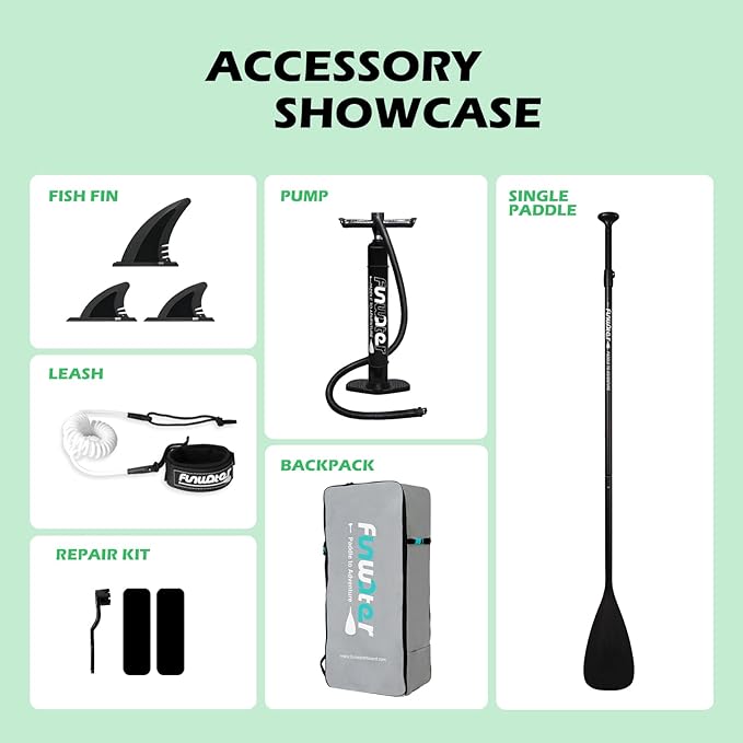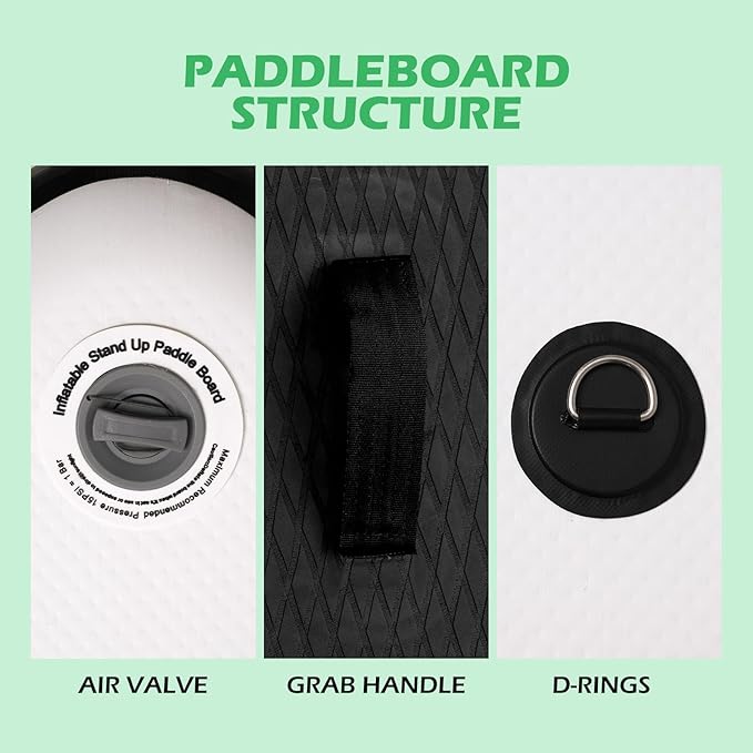 • 【Package Including】1×inflatable paddle board, 1×adjustable sup paddle ,3×fins , 1×sup pump , 1×backpack , 1×leash