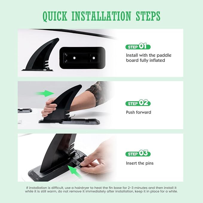 • 【Manoeuvrable & Safe】 The paddle board is equipped with 3 fins, allowing you to glide and steer more steadily, and have better control of the paddle board when standing on it. Upgraded non-slip EVA deck pads provide great cushioning, you can stand more steadily and effectively prevent slipping.