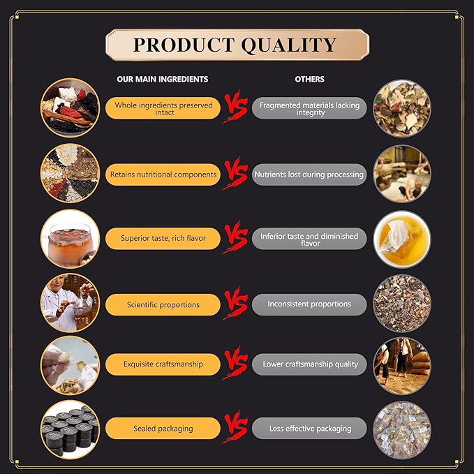 • 【Functionality and Flavor】This herbal tea nourishes the kidneys, tones the liver, enhances vitality, relieves fatigue, and helps release stress. The tea has a rich flavor with natural sweetness, perfectly blending the essence of various herbs, making each sip a delightful experience.