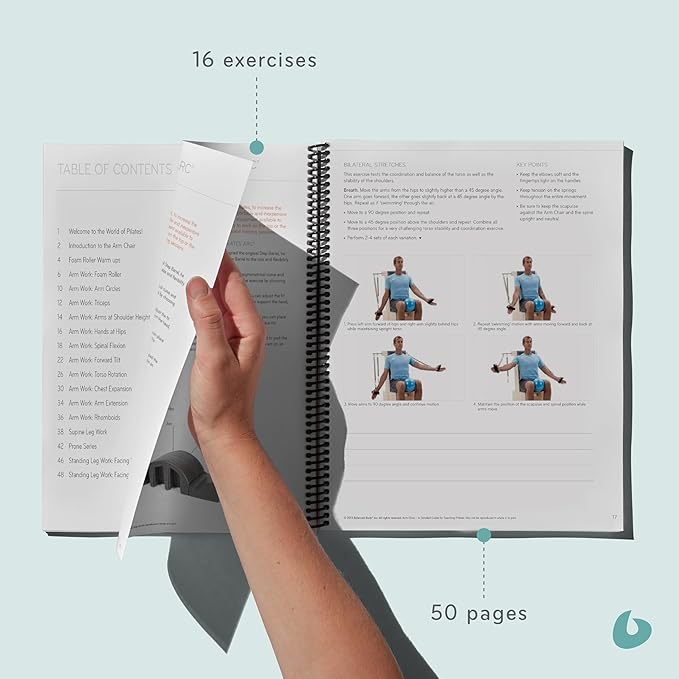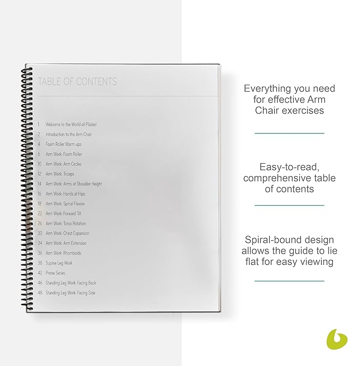 • PILATES EQUIPMENT GUIDE: Maximize your Pilates workout with our Arm Chair guide. This useful exercise guide features 50 pages with 16 exercises, full-color pictures, and step-by-step instructions so you can get the most from your chair workout.