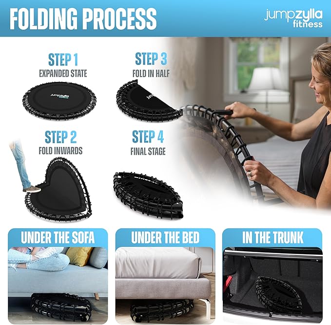 • Compact, Foldable Design - Perfect for Any Space: Jumpzylla's foldable rebounder is easy to store in small spaces like closets, under beds, or even car trunks. Ideal for apartments and home gyms, our indoor trampoline makes a convenient fitness solution without taking up space.