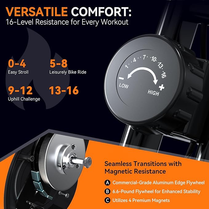 • 16-LEVEL MAGNETIC RESISTANCE FOR ULTIMATE WORKOUT CONTROL: Take your workout to the next level with our bike's 16-level magnetic resistance system! Equipped with four high-grade magnets and a 6.6-pound aluminum-rimmed flywheel, this indoor bike provides seamless and whisper-quiet resistance adjustments. Whether you're just starting out or a seasoned athlete, you can easily find the ideal challenge to push your limits.