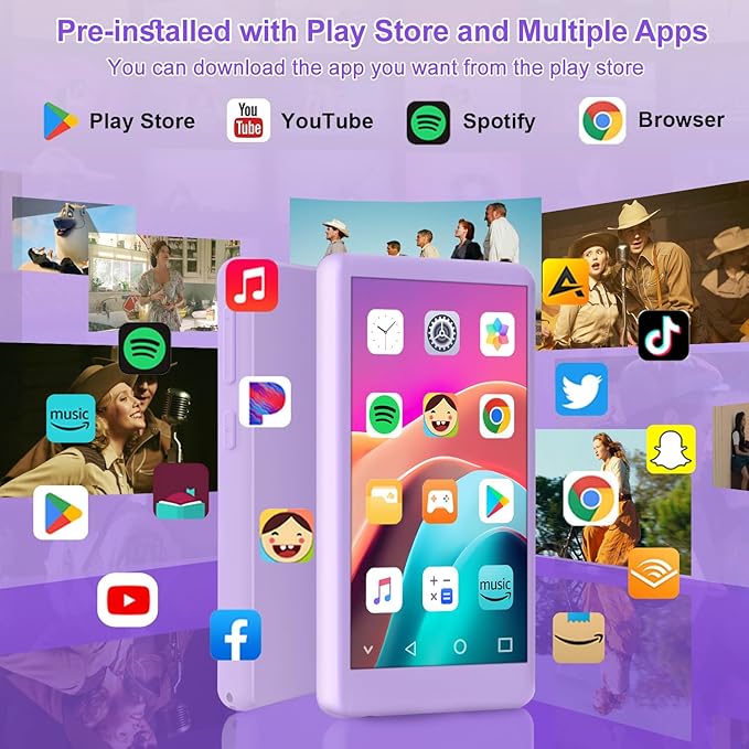 • 【Multiple Music and video Options】 The Bluetooth MP3 Player is equipped with high-quality lossless speakers and has multiple playback modes to immerse you in the world of music. We pre-installed many apps for Spotify, Audible, Android Music Player and so on. and you can download and install any apps you like for HiBy, Tiktok, YouTube, etc. in the app store