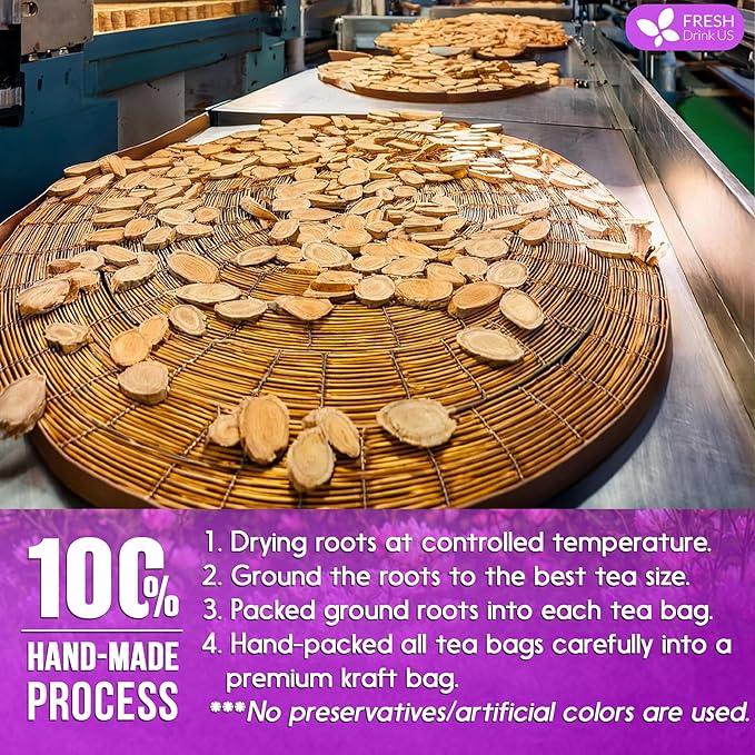 • ☘️ HAND-MADE PRODUCING PROCESSES, NO ADDITIVES: Our Astragalus root were processed in a hygienic environment, and then packed in a Re-sealable bag to make a long self-life product, ensure the safety of customers and quality of products. Sugar-Free, Caffeine Free, Gluten Free, Vegan, No Artificial Flavors, No Colors Added.