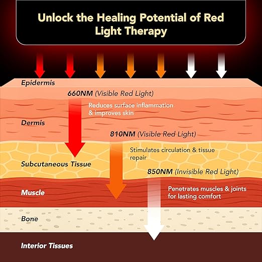 • BENEFITS OF RED LIGHT THERAPY — 660nm and 8100nm red light are effectively absorbed by the skin to improve skin appearance, boost collagen production, and speed up wound healing. 850nm near-infrared light penetrates deeper into muscles, joints, and tissues to enhance recovery, reduce inflammation, and relieve joint pain.