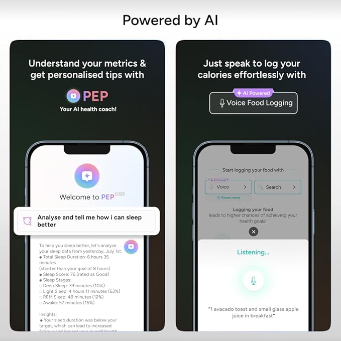 • AI POWERED: PEP, VOICE BASED FOOD LOGGING: PEP is your AI-powered health coach that decodes your fitness, sleep, and stress metrics. It tracks changes and gives personalised, actionable tips to keep you on track. Also, with Voice-based food logging you just speak into your phone to log meals - making nutrition tracking quick, easy, and hassle-free.