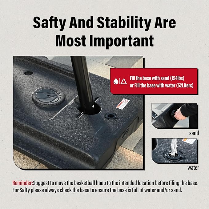 • 【Stable Construction】:The basketball hoop features a strong and extra-large base can be filled with water and sand to ensure excellent stability. The triangular structure formed by the pole, base, and rebound plate creates a very stable structure, make sure your safety during play