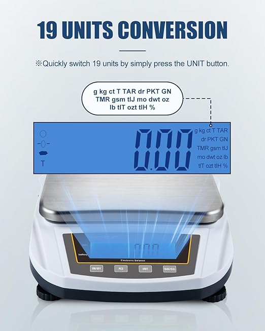 • Switch Seamlessly Between Multiple Units such as grams, ounces, carats, and pounds, providing versatility for weighing ingredients, jewelry, or lab materials.