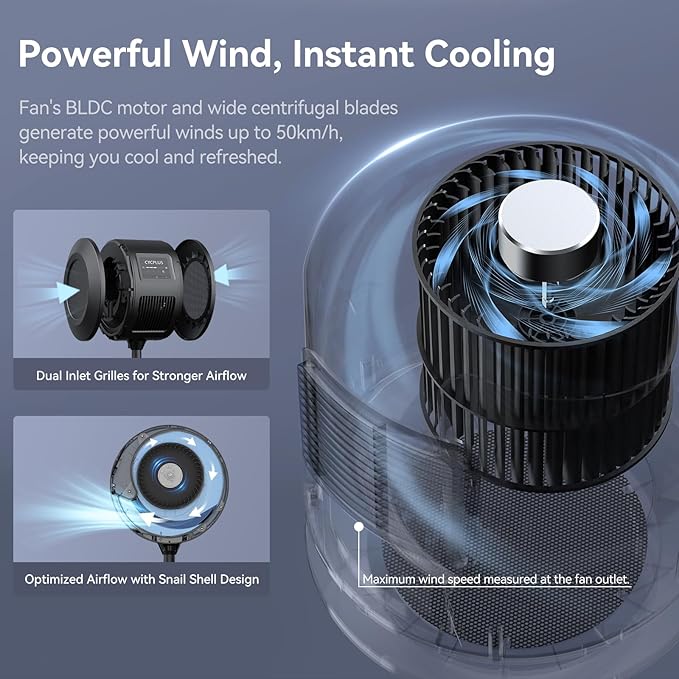 • 【Powerful Wind, Instant Cooling】The BLDC motor and wide centrifugal blades generate powerful winds up to 50km/h, keeping you cool and refreshed. (Maximum wind speed measured at the fan outlet)